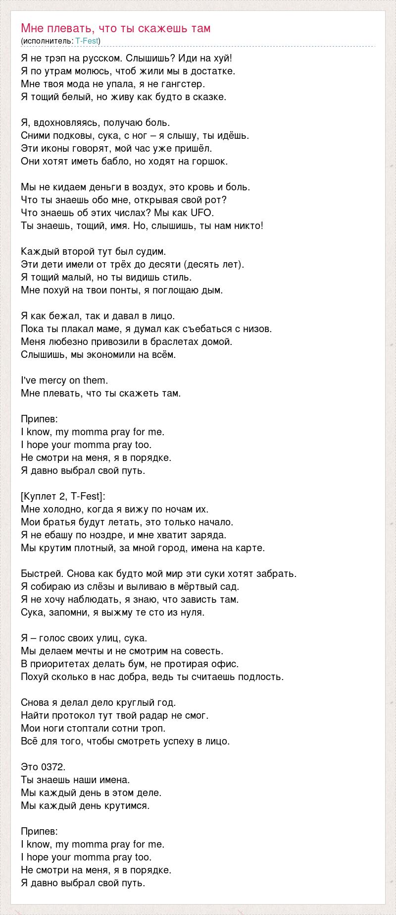 Я не трэп на русском. Слышишь? Иди на хуй! Я по утрам молюсь, чтоб жили мы в достатке. Мне твоя мода не упала, я не гангстер. Я тощий белый, но живу как будто в сказке. Я, вдохновляясь, получаю боль. Сними подковы, сука, с ног – я слышу, ты идёшь. Эти иконы говорят, мой час уже пришёл. Они хотят иметь бабло, но ходят на горшок. Мы не кидаем деньги в воздух, это кровь и боль. Что ты знаешь обо мне, открывая свой рот? Что знаешь об этих числах? Мы как UFO. Ты знаешь, тощий, имя. Но, слышишь, ты нам никто! Каждый второй тут был судим. Эти дети имели от трёх до десяти (десять лет). Я тощий малый, но ты видишь стиль. Мне похуй на твои понты, я поглощаю дым. Я как бежал, так и давал в лицо. Пока ты плакал маме, я думал как съебаться с низов. Меня любезно привозили в браслетах домой. Слышишь, мы экономили на всём. I've mercy on them. Мне плевать, что ты скажеть там. Припев: I know, my momma pray for me. I hope your momma pray too. Не смотри на меня, я в порядке. Я давно выбрал свой путь. [Куплет 2, T-Fest]: Мне холодно, когда я вижу по ночам их. Мои братья будут летать, это только начало. Я не ебашу по ноздре, и мне хватит заряда. Мы крутим плотный, за мной город, имена на карте. Быстрей. Снова как будто мой мир эти суки хотят забрать. Я собираю из слёзы и выливаю в мёртвый сад. Я не хочу наблюдать, я знаю, что зависть там. Сука, запомни, я выжму те сто из нуля. Я – голос своих улиц, сука. Мы делаем мечты и не смотрим на совесть. В приоритетах делать бум, не протирая офис. Похуй сколько в нас добра, ведь ты считаешь подлость. Снова я делал дело круглый год. Найти протокол тут твой радар не смог. Мои ноги стоптали сотни троп. Всё для того, чтобы смотреть успеху в лицо. Это 0372. Ты знаешь наши имена. Мы каждый день в этом деле. Мы каждый день крутимся. Припев: I know, my momma pray for me. I hope your momma pray too. Не смотри на меня, я в порядке. Я давно выбрал свой путь.