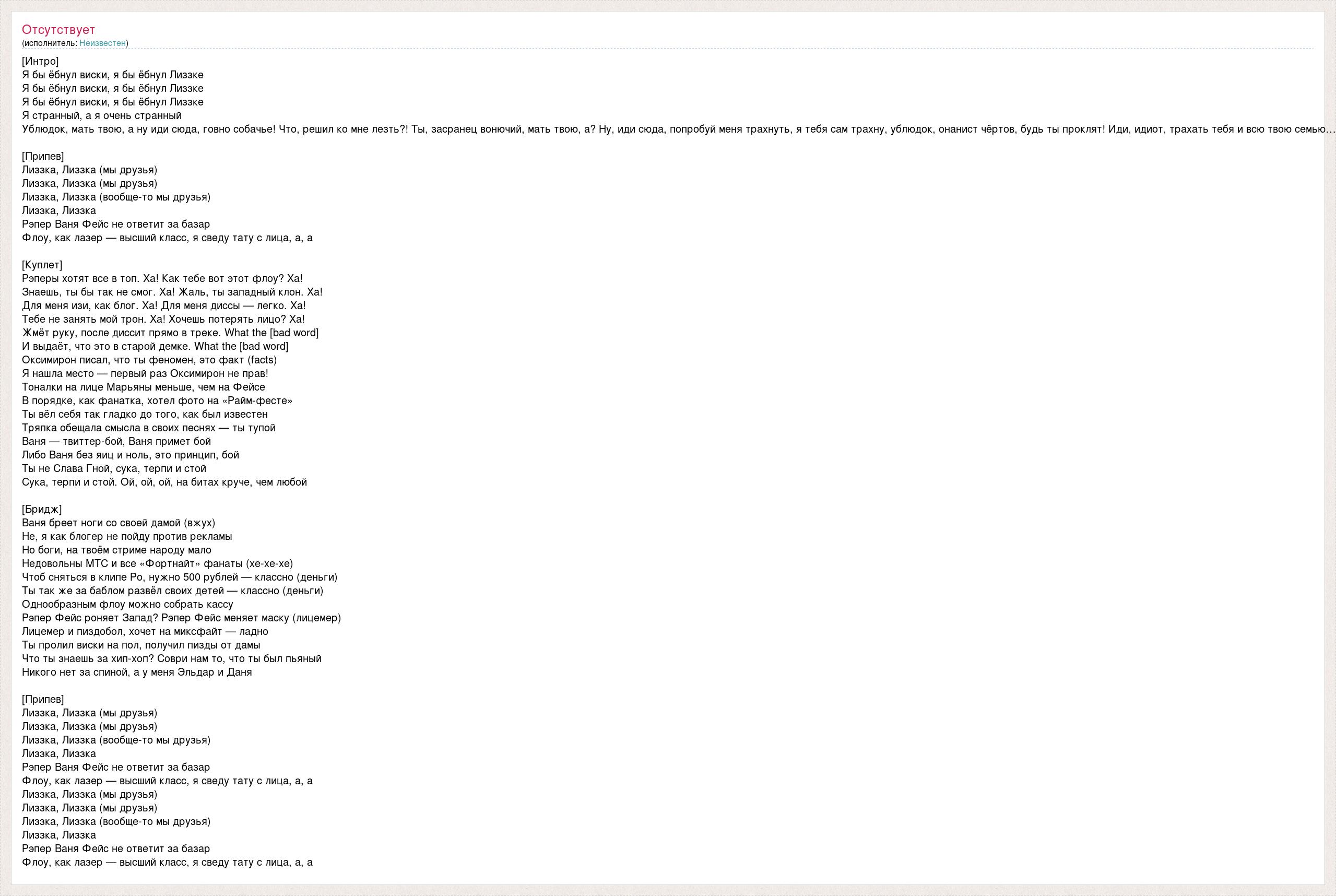 [Интро] Я бы ёбнул виски, я бы ёбнул Лиззке Я бы ёбнул виски, я бы ёбнул Лиззке Я бы ёбнул виски, я бы ёбнул Лиззке Я странный, а я очень странный Ублюдок, мать твою, а ну иди сюда, говно собачье! Что, решил ко мне лезть?! Ты, засранец вонючий, мать твою, а? Ну, иди сюда, попробуй меня трахнуть, я тебя сам трахну, ублюдок, онанист чёртов, будь ты проклят! Иди, идиот, трахать тебя и всю твою семью… [Припев] Лиззка, Лиззка (мы друзья) Лиззка, Лиззка (мы друзья) Лиззка, Лиззка (вообще-то мы друзья) Лиззка, Лиззка Рэпер Ваня Фейс не ответит за базар Флоу, как лазер — высший класс, я сведу тату с лица, а, а [Куплет] Рэперы хотят все в топ. Ха! Как тебе вот этот флоу? Ха! Знаешь, ты бы так не смог. Ха! Жаль, ты западный клон. Ха! Для меня изи, как блог. Ха! Для меня диссы — легко. Ха! Тебе не занять мой трон. Ха! Хочешь потерять лицо? Ха! Жмёт руку, после диссит прямо в треке. What the [bad word] И выдаёт, что это в старой демке. What the [bad word] Оксимирон писал, что ты феномен, это факт (facts) Я нашла место — первый раз Оксимирон не прав! Тоналки на лице Марьяны меньше, чем на Фейсе В порядке, как фанатка, хотел фото на «Райм-фесте» Ты вёл себя так гладко до того, как был известен Тряпка обещала смысла в своих песнях — ты тупой Ваня — твиттер-бой, Ваня примет бой Либо Ваня без яиц и ноль, это принцип, бой Ты не Слава Гной, сука, терпи и стой Сука, терпи и стой. Ой, ой, ой, на битах круче, чем любой [Бридж] Ваня бреет ноги со своей дамой (вжух) Не, я как блогер не пойду против рекламы Но боги, на твоём стриме народу мало Недовольны МТС и все «Фортнайт» фанаты (хе-хе-хе) Чтоб сняться в клипе Ро, нужно 500 рублей — классно (деньги) Ты так же за баблом развёл своих детей — классно (деньги) Однообразным флоу можно собрать кассу Рэпер Фейс роняет Запад? Рэпер Фейс меняет маску (лицемер) Лицемер и пиздобол, хочет на миксфайт — ладно Ты пролил виски на пол, получил пизды от дамы Что ты знаешь за хип-хоп? Соври нам то, что ты был пьяный Никого нет за спиной, а у меня Эльдар и Даня [Припев] Лиззка, Лиззка (мы друзья) Лиззка, Лиззка (мы друзья) Лиззка, Лиззка (вообще-то мы друзья) Лиззка, Лиззка Рэпер Ваня Фейс не ответит за базар Флоу, как лазер — высший класс, я сведу тату с лица, а, а Лиззка, Лиззка (мы друзья) Лиззка, Лиззка (мы друзья) Лиззка, Лиззка (вообще-то мы друзья) Лиззка, Лиззка Рэпер Ваня Фейс не ответит за базар Флоу, как лазер — высший класс, я сведу тату с лица, а, а