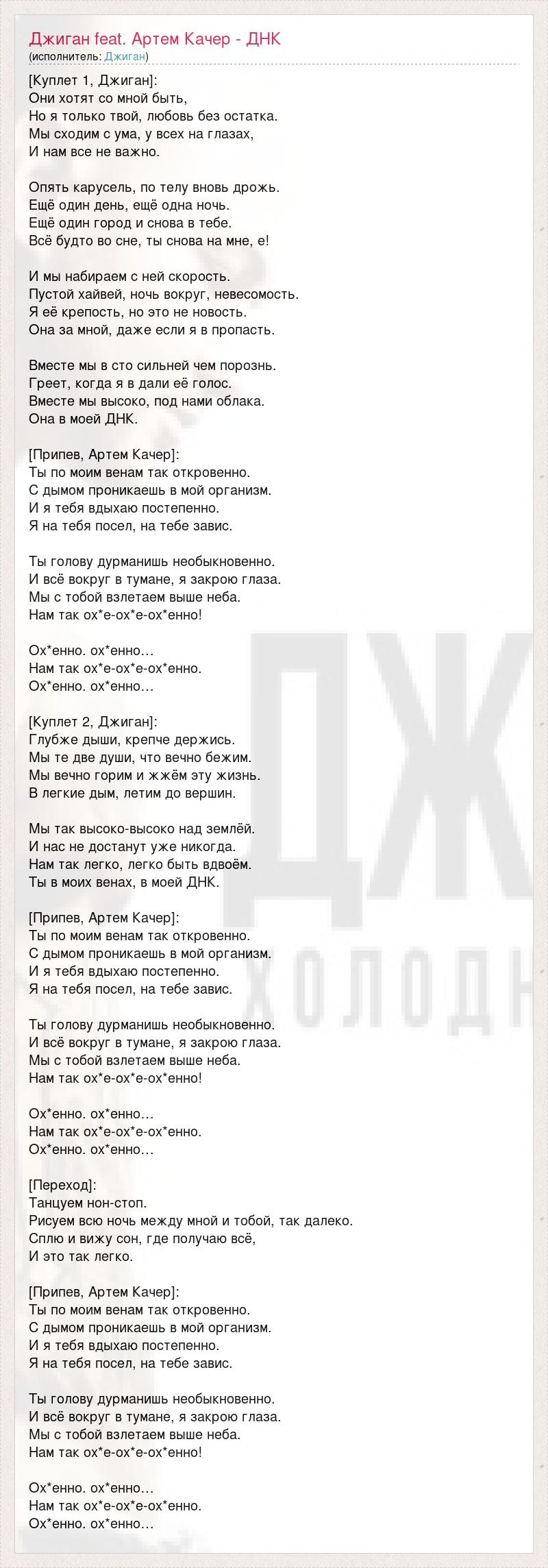 [Куплет 1, Джиган]: Они хотят со мной быть, Но я только твой, любовь без остатка. Мы сходим с ума, у всех на глазах, И нам все не важно. Опять карусель, по телу вновь дрожь. Ещё один день, ещё одна ночь. Ещё один город и снова в тебе. Всё будто во сне, ты снова на мне, е! И мы набираем с ней скорость. Пустой хайвей, ночь вокруг, невесомость. Я её крепость, но это не новость. Она за мной, даже если я в пропасть. Вместе мы в сто сильней чем порознь. Греет, когда я в дали её голос. Вместе мы высоко, под нами облака. Она в моей ДНК. [Припев, Артем Качер]: Ты по моим венам так откровенно. С дымом проникаешь в мой организм. И я тебя вдыхаю постепенно. Я на тебя посел, на тебе завис. Ты голову дурманишь необыкновенно. И всё вокруг в тумане, я закрою глаза. Мы с тобой взлетаем выше неба. Нам так ох*е-ох*е-ох*енно! Ох*енно. ох*енно… Нам так ох*е-ох*е-ох*енно. Ох*енно. ох*енно… [Куплет 2, Джиган]: Глубже дыши, крепче держись. Мы те две души, что вечно бежим. Мы вечно горим и жжём эту жизнь. В легкие дым, летим до вершин. Мы так высоко-высоко над землёй. И нас не достанут уже никогда. Нам так легко, легко быть вдвоём. Ты в моих венах, в моей ДНК. [Припев, Артем Качер]: Ты по моим венам так откровенно. С дымом проникаешь в мой организм. И я тебя вдыхаю постепенно. Я на тебя посел, на тебе завис. Ты голову дурманишь необыкновенно. И всё вокруг в тумане, я закрою глаза. Мы с тобой взлетаем выше неба. Нам так ох*е-ох*е-ох*енно! Ох*енно. ох*енно… Нам так ох*е-ох*е-ох*енно. Ох*енно. ох*енно… [Переход]: Танцуем нон-стоп. Рисуем всю ночь между мной и тобой, так далеко. Сплю и вижу сон, где получаю всё, И это так легко. [Припев, Артем Качер]: Ты по моим венам так откровенно. С дымом проникаешь в мой организм. И я тебя вдыхаю постепенно. Я на тебя посел, на тебе завис. Ты голову дурманишь необыкновенно. И всё вокруг в тумане, я закрою глаза. Мы с тобой взлетаем выше неба. Нам так ох*е-ох*е-ох*енно! Ох*енно. ох*енно… Нам так ох*е-ох*е-ох*енно. Ох*енно. ох*енно…