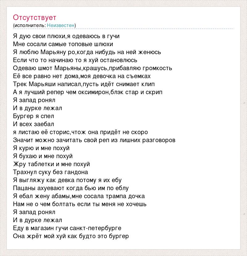 Я дую свои плюхи,я одеваюсь в гучи Мне сосали самые топовые шлюхи Я люблю Марьяну ро,когда нибудь на ней женюсь Если что то начинаю то я хуй остановлюсь Одеваю шмот Марьяны,крашусь,прибавляю громкость Её все равно нет дома,моя девочка на съемках Трек Марьяши написал,пусть идёт снимает клип А я лучший репер чем оксимирон,блэк стар и скрип Я запад ронял И в дурке лежал Бургер я спел И всех заебал я листаю её сторис,чтож она придёт не скоро Значит можно зачитать свой реп из лишних разговоров Я курю и мне похуй Я бухаю и мне похуй Жру таблетки и мне похуй Трахнул суку без гандона Я выгляжу как девка потому я их ебу Пацаны ахуевают когда бью им по еблу Я ебал жену абамы,мне сосала трампа дочка Нам не о чем болтать если ты меня не хочешь Я запад ронял И в дурке лежал Еду в магазин гучи санкт-петербурге Она жрёт мой хуй как будто это бургер