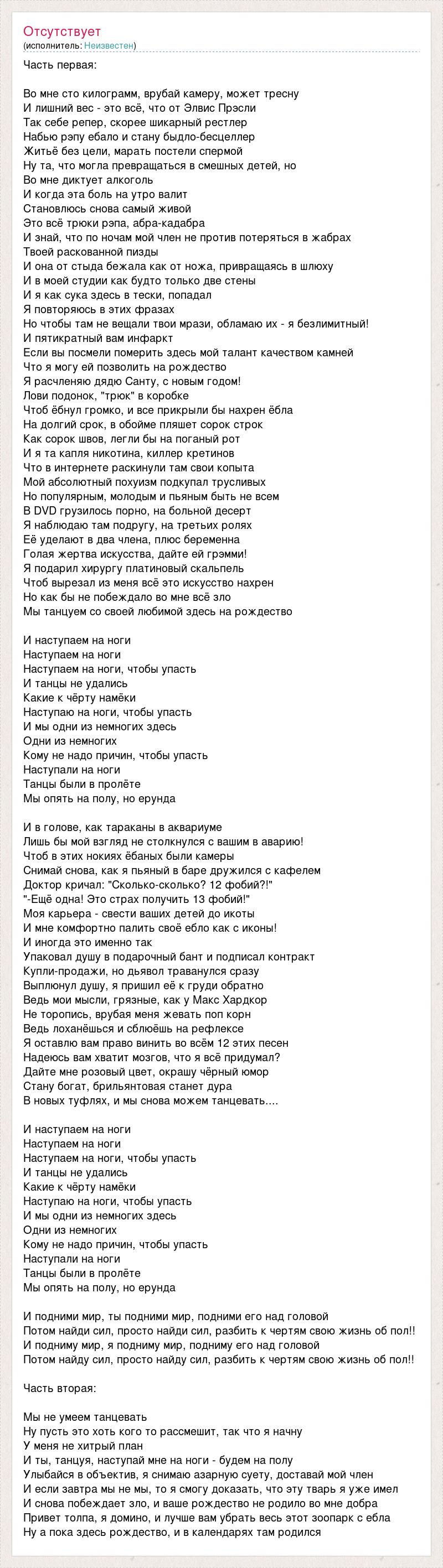 Часть первая: Во мне сто килограмм, врубай камеру, может тресну И лишний вес - это всё, что от Элвис Прэсли Так себе репер, скорее шикарный рестлер Набью рэпу ебало и стану быдло-бесцеллер Житьё без цели, марать постели спермой Ну та, что могла превращаться в смешных детей, но Во мне диктует алкоголь И когда эта боль на утро валит Становлюсь снова самый живой Это всё трюки рэпа, абра-кадабра И знай, что по ночам мой член не против потеряться в жабрах Твоей раскованной пизды И она от стыда бежала как от ножа, привращаясь в шлюху И в моей студии как будто только две стены И я как сука здесь в тески, попадал Я повторяюсь в этих фразах Но чтобы там не вещали твои мрази, обламаю их - я безлимитный! И пятикратный вам инфаркт Если вы посмели померить здесь мой талант качеством камней Что я могу ей позволить на рождество Я расчленяю дядю Санту, с новым годом! Лови подонок, "трюк" в коробке Чтоб ёбнул громко, и все прикрыли бы нахрен ёбла На долгий срок, в обойме пляшет сорок строк Как сорок швов, легли бы на поганый рот И я та капля никотина, киллер кретинов Что в интернете раскинули там свои копыта Мой абсолютный похуизм подкупал трусливых Но популярным, молодым и пьяным быть не всем В DVD грузилось порно, на больной десерт Я наблюдаю там подругу, на третьих ролях Её уделают в два члена, плюс беременна Голая жертва искусства, дайте ей грэмми! Я подарил хирургу платиновый скальпель Чтоб вырезал из меня всё это искусство нахрен Но как бы не побеждало во мне всё зло Мы танцуем со своей любимой здесь на рождество И наступаем на ноги Наступаем на ноги Наступаем на ноги, чтобы упасть И танцы не удались Какие к чёрту намёки Наступаю на ноги, чтобы упасть И мы одни из немногих здесь Одни из немногих Кому не надо причин, чтобы упасть Наступали на ноги Танцы были в пролёте Мы опять на полу, но ерунда И в голове, как тараканы в аквариуме Лишь бы мой взгляд не столкнулся с вашим в аварию! Чтоб в этих нокиях ёбаных были камеры Снимай снова, как я пьяный в баре дружился с кафелем Доктор кричал: "Сколько-сколько? 12 фобий?!" "-Ещё одна! Это страх получить 13 фобий!" Моя карьера - свести ваших детей до икоты И мне комфортно палить своё ебло как с иконы! И иногда это именно так Упаковал душу в подарочный бант и подписал контракт Купли-продажи, но дьявол траванулся сразу Выплюнул душу, я пришил её к груди обратно Ведь мои мысли, грязные, как у Макс Хардкор Не торопись, врубая меня жевать поп корн Ведь лоханёшься и сблюёшь на рефлексе Я оставлю вам право винить во всём 12 этих песен Надеюсь вам хватит мозгов, что я всё придумал? Дайте мне розовый цвет, окрашу чёрный юмор Стану богат, брильянтовая станет дура В новых туфлях, и мы снова можем танцевать.... И наступаем на ноги Наступаем на ноги Наступаем на ноги, чтобы упасть И танцы не удались Какие к чёрту намёки Наступаю на ноги, чтобы упасть И мы одни из немногих здесь Одни из немногих Кому не надо причин, чтобы упасть Наступали на ноги Танцы были в пролёте Мы опять на полу, но ерунда И подними мир, ты подними мир, подними его над головой Потом найди сил, просто найди сил, разбить к чертям свою жизнь об пол!! И подниму мир, я подниму мир, подниму его над головой Потом найду сил, просто найду сил, разбить к чертям свою жизнь об пол!! Часть вторая: Мы не умеем танцевать Ну пусть это хоть кого то рассмешит, так что я начну У меня не хитрый план И ты, танцуя, нас