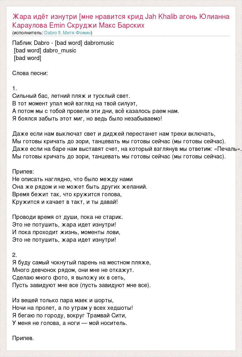 Паблик Dabro - [bad word] dabromusic [bad word] dabro_music [bad word] Слова песни: 1. Сильный бас, летний пляж и тусклый свет. В тот момент упал мой взгляд на твой силуэт, А потом мы с тобой провели эти дни, всё казалось раем нам. Я боялся забыть этот миг, но ведь было незабываемо! Даже если нам выключат свет и диджей перестанет нам треки включать, Мы готовы кричать до зори, танцевать мы готовы сейчас (мы готовы сейчас). Даже если на баре нам выставят счет, на который взглянув мы ответим: «Печаль». Мы готовы кричать до зори, танцевать мы готовы сейчас (мы готовы сейчас). Припев: Не описать наглядно, что было между нами Она же рядом и не может быть других желаний. Время бежит так, что кружится голова, Кружится и качает в такт, и ты давай! Проводи время от души, пока не старик. Это не потушить, жара идет изнутри! И пока проходит жизнь, моменты лови, Это не потушить, жара идет изнутри! 2. Я буду самый чокнутый парень на местном пляже, Много девчонок рядом, они мне не откажут. Сделаю много фото, я выложу их в сеть, Пусть завидуют мне все (пусть завидуют мне все). Из вещей только пара маек и шорты, Ночи на пролет, а по утрам у всех хедшоты! Я бегаю по городу, вокруг Трамвай Сити, У меня не голова, а ноги — мой носитель. Припев.