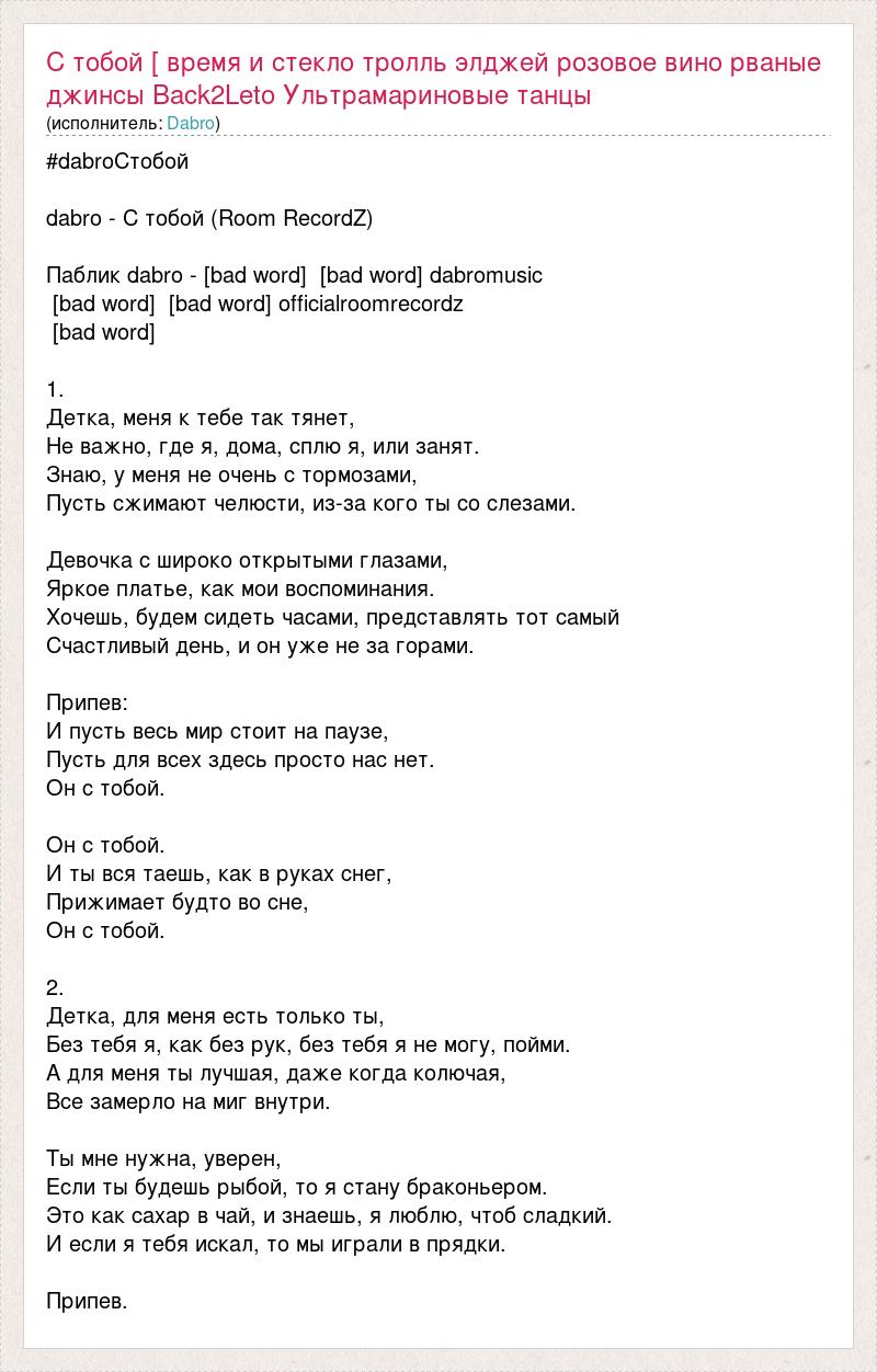 #dabroСтобой dabro - С тобой (Room RecordZ) Паблик dabro - [bad word] [bad word] dabromusic [bad word] [bad word] officialroomrecordz [bad word] 1. Детка, меня к тебе так тянет, Не важно, где я, дома, сплю я, или занят. Знаю, у меня не очень с тормозами, Пусть сжимают челюсти, из-за кого ты со слезами. Девочка с широко открытыми глазами, Яркое платье, как мои воспоминания. Хочешь, будем сидеть часами, представлять тот самый Счастливый день, и он уже не за горами. Припев: И пусть весь мир стоит на паузе, Пусть для всех здесь просто нас нет. Он с тобой. Он с тобой. И ты вся таешь, как в руках снег, Прижимает будто во сне, Он с тобой. 2. Детка, для меня есть только ты, Без тебя я, как без рук, без тебя я не могу, пойми. А для меня ты лучшая, даже когда колючая, Все замерло на миг внутри. Ты мне нужна, уверен, Если ты будешь рыбой, то я стану браконьером. Это как сахар в чай, и знаешь, я люблю, чтоб сладкий. И если я тебя искал, то мы играли в прядки. Припев.