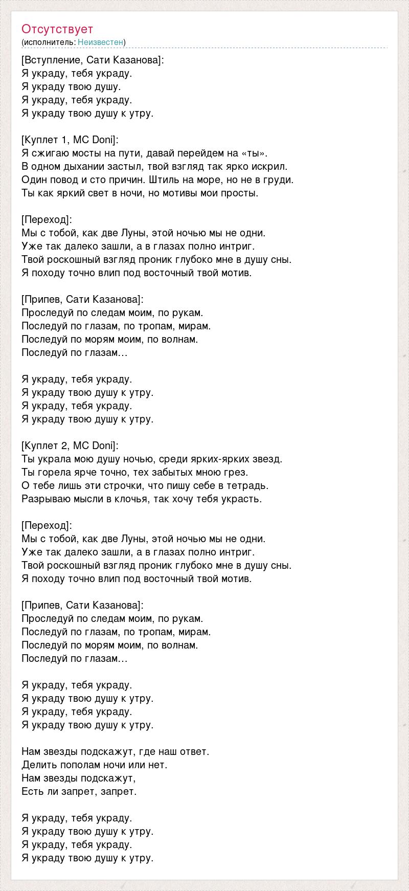 [Вступление, Сати Казанова]: Я украду, тебя украду. Я украду твою душу. Я украду, тебя украду. Я украду твою душу к утру. [Куплет 1, MC Doni]: Я сжигаю мосты на пути, давай перейдем на «ты». В одном дыхании застыл, твой взгляд так ярко искрил. Один повод и сто причин. Штиль на море, но не в груди. Ты как яркий свет в ночи, но мотивы мои просты. [Переход]: Мы с тобой, как две Луны, этой ночью мы не одни. Уже так далеко зашли, а в глазах полно интриг. Твой роскошный взгляд проник глубоко мне в душу сны. Я походу точно влип под восточный твой мотив. [Припев, Сати Казанова]: Проследуй по следам моим, по рукам. Последуй по глазам, по тропам, мирам. Последуй по морям моим, по волнам. Последуй по глазам… Я украду, тебя украду. Я украду твою душу к утру. Я украду, тебя украду. Я украду твою душу к утру. [Куплет 2, MC Doni]: Ты украла мою душу ночью, среди ярких-ярких звезд. Ты горела ярче точно, тех забытых мною грез. О тебе лишь эти строчки, что пишу себе в тетрадь. Разрываю мысли в клочья, так хочу тебя украсть. [Переход]: Мы с тобой, как две Луны, этой ночью мы не одни. Уже так далеко зашли, а в глазах полно интриг. Твой роскошный взгляд проник глубоко мне в душу сны. Я походу точно влип под восточный твой мотив. [Припев, Сати Казанова]: Проследуй по следам моим, по рукам. Последуй по глазам, по тропам, мирам. Последуй по морям моим, по волнам. Последуй по глазам… Я украду, тебя украду. Я украду твою душу к утру. Я украду, тебя украду. Я украду твою душу к утру. Нам звезды подскажут, где наш ответ. Делить пополам ночи или нет. Нам звезды подскажут, Есть ли запрет, запрет. Я украду, тебя украду. Я украду твою душу к утру. Я украду, тебя украду. Я украду твою душу к утру.